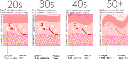 Lão hóa da với các biểu hiện: da hình thành nếp nhăn, nếp gấp; da khô, thiếu sức sống; da chùng nhão, mất tính đàn hồi…liên quan mật thiết với sự hao hụt của collagen. Đàn ông mất khoảng 1% collagen mỗi năm sau tuổi 30. Nhưng ở phụ nữ, từ 25 tuổi, mỗi năm cơ mất đi 1 – 1,5% lượng collagen, sự chênh lệch này dẫn đến tình trạng da nhanh lão hóa hơn nam giới.
